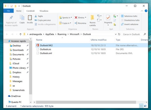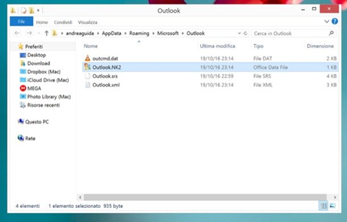 Nella finestra che si apre, individua il file Outlook.NK2 e copialo su una chiavetta USB o in una cartella di tua scelta, in modo da averlo a portata di mano per il trasferimento su un altro PC e/o un’altra installazione di Outlook.