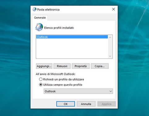 Dopodiché vai su Posta elettronica, pigia sul pulsante Mostra profili che si trova nella finestra che si apre e controlla il nome del tuo profilo Outlook. Se il nome del profilo dovesse risultare diverso da “Outlook”, rinomina il file NK2 di conseguenza (se, per esempio, il tuo profilo si chiama “Utente”, devi rinominare il file in “Utente.NK2”).
