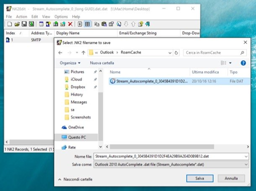 Successivamente, recati nel menu File > Save as, seleziona la voce Outlook 2010 AutoComplete .dat file (Stream_Autocomplete*.dat) dal menu a tendina Salva come e salva il file nella cartella C:\Users\tuonome\AppData\Local\Microsoft\Outlook\RoamCache sovrascrivendo il file Stream_Autocomplete_0_[xx].dat presente attualmente nella cartella.