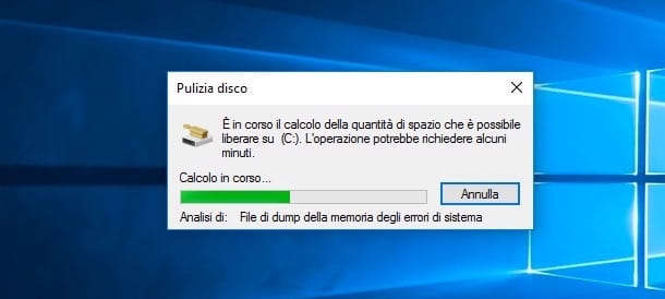 Fatto ciò vedrai comparire la finestra di Pulizia disco sul desktop. A questo punto se ti viene chiesto di scegliere un’unità su cui agire seleziona quella su cui hai installato Windows (presumibilmente C:) e poi fai clic sul pulsante OK. Effettuati questi passaggi verrà avviata automaticamente la procedura di calcolo della quantità di spazio che è possibile liberare su disco. Tieni conto che l’operazione può richiedere diversi minuti, tutto dipende dalla quantità di elementi archiviati sul tuo computer. Quindi mi raccomando, cerca di portare pazienza e non allarmarti nel caso in cui l’operazione dovesse richiedere più tempo di quel che avevi immaginato.