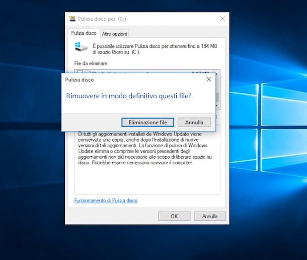 Nella nuova finestra che a questo punto ti verrà mostrata a schermo pigia sul comando Elimina file o Eliminazione file dopodiché attendi che la procedura per cancellare Windows Old venga avviata e portata a termine.